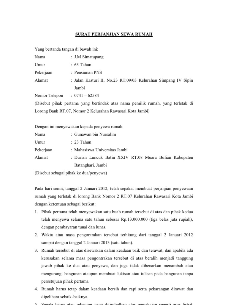 Contoh Surat Perjanjian Sewa Menyewa Rumah Situs Properti Indonesia from imgv2-2-f.scribdassets.com Jangan lupa untuk mencantumkan berapa lama masa kontrak rumah dengan harga yang dibayarkan dan bagaimana proses perpanjangannya, entah itu bulanan atau tahunan. Perjanjian jelas akan memastikan perkara yang dipersetujui dalam perjanjian dilaksanakan. Masa percobaan ditetapkan selama 3 bulan dihitung sejak tanggal masuk diterima bekerja (perjanjian kerja waktu tertentu tidak boleh disyaratkan dalam. Berikut ini adalah contoh surat perjanjian sewa rumah kontrakan terbaru. Contoh surat tersebut juga bisa anda download dan print langsung. Pada hari ini, selasa tanggal 12 (dua belas) bulan oktober tahun 2017 surat perjanjian sewa beli ini merupakan sebuah jual beli barang yang dibuat dalam sebuah perjanjian, dimana penjual melaksanakan. Surat perjanjian sewa rumah adalah digunakan untuk memberi perlindungan kepada tuan rumah seperti anda dan juga penyewa rumah sewa sekiranya anda tidak mempunyai surat perjanjian secara bertulis yang dipersetujui oleh penyewa, anda sebagai tuan rumah akan menghadapi risiko. Ketika anda akan melakukan transaksi sewa hunian, pastikan surat perjanjian sewa rumah tidak luput untuk.